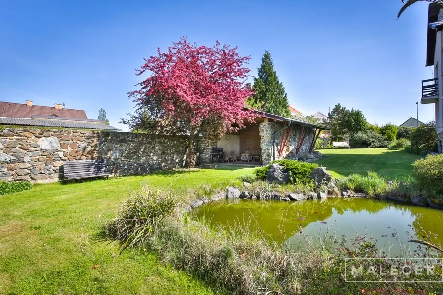 Vzrostlé stromy poskytují přirozený stín, zatímco zahradní jezírko dodává celému prostoru klidnou atmosféru.